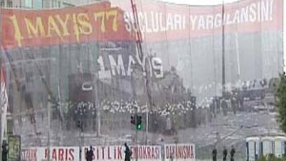 Kanlı 1 Mayıs olarak bilinen 1977’deki kutlamaların simgesi olan pankart ile Atatürk Anıtı’nın çevresi perdelenerek muhtemel bir duruma karşı önlem alındı.
