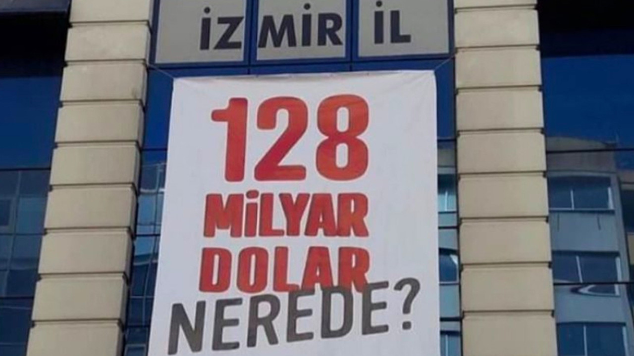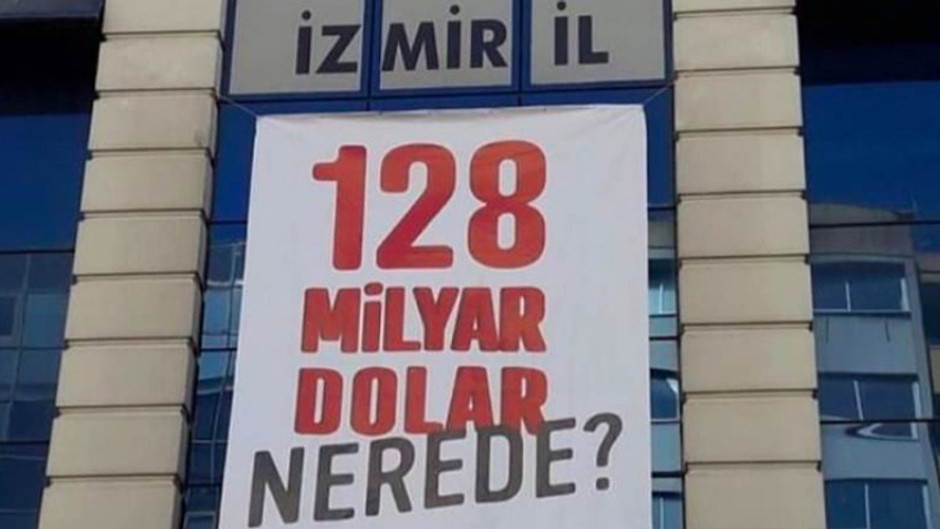 14 Nisan 2021'de CHP İzmir İl Binası'na astırılan "128 milyar dolar nerede" pankartı İzmir Valiliği'nin kararı ve polis ekiplerinin müdahalesiyle aynı gün akşam saatlerinde indirilmişti.