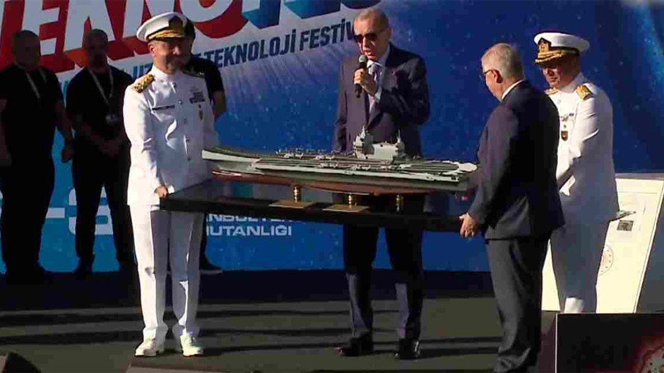 Erdoğan'ın savunma sanayisinin gelişimiyle ilgili konuşmasının ardından kürsüye gelen Milli Savunma Bakanı Yaşar Güler ve iki amiral, Erdoğan’ın önünde maket taşıdı.