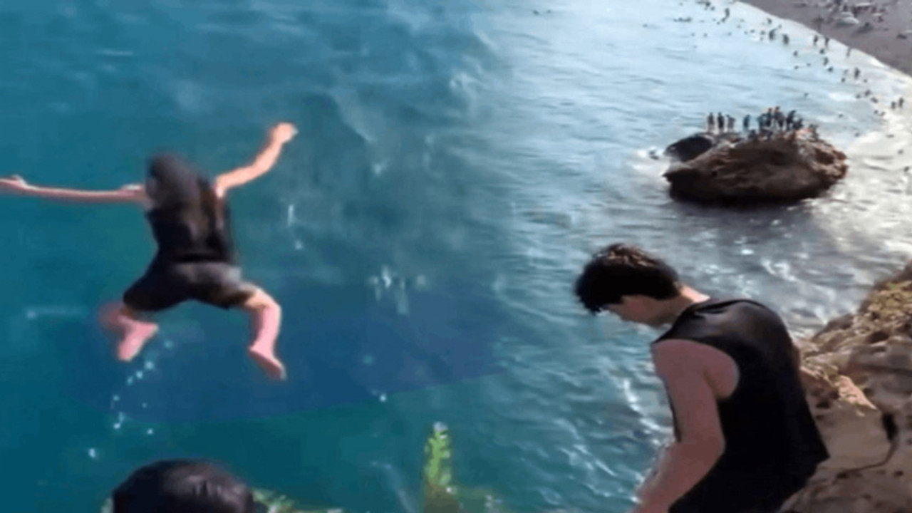 Antalya'da yaklaşık 40 metre yükseklikteki falezlerden denize atlayan Suriyeli Mohammad Al M. (18), karnının üzerine düşerek ağır yaralandı. O anlar, arkadaşları tarafından cep telefonuyla kaydedildi.