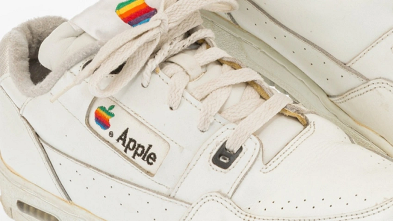 Müzayede Evi, Apple'ın gökkuşağı renkli eski logosunun olduğu beyaz renkli deri ayakkabıların hiç kullanılmadığını ancak bazı kısımlarında sararmalar olduğunu açıkladı.