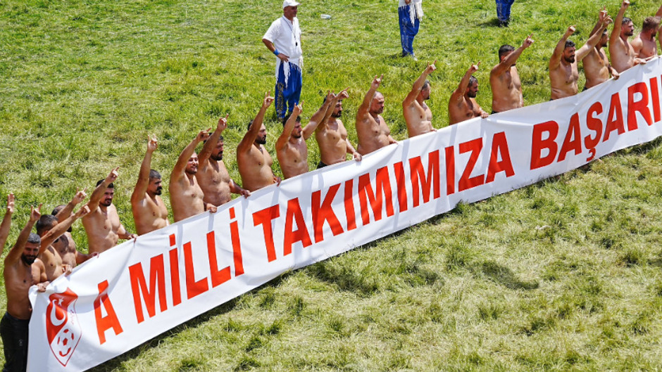 Baş boyunda güreşecek pehlivanlar, seyirciye takdim edildi, pehlivanlar aynı zamanda "A Milli Takımımıza başarılar dileriz" pankartı da açtı.