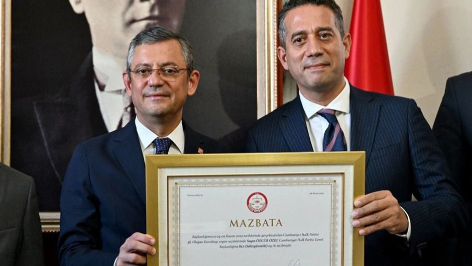 Cumhuriyet Halk Partisi'nin (CHP) 38. Olağan Kurultayı'nda Kemal Kılıçdaroğlu ile yarışan ve 2. turda oyların büyük bir bölümünü alarak CHP'nin 8. Genel Başkanı seçilen Özgür Özel, mazbatasını aldı. Özel'e mazbatasını Türkiye Büyük Millet Meclisi'ndeki makam odasında gerçekleştirilen törende Grup Başkanvekili Ali Mahir Başarır takdim etti. Mazbata törenine Kemal Kılıçdaroğlu'nun katılmaması ise gözlerden kaçmadı.