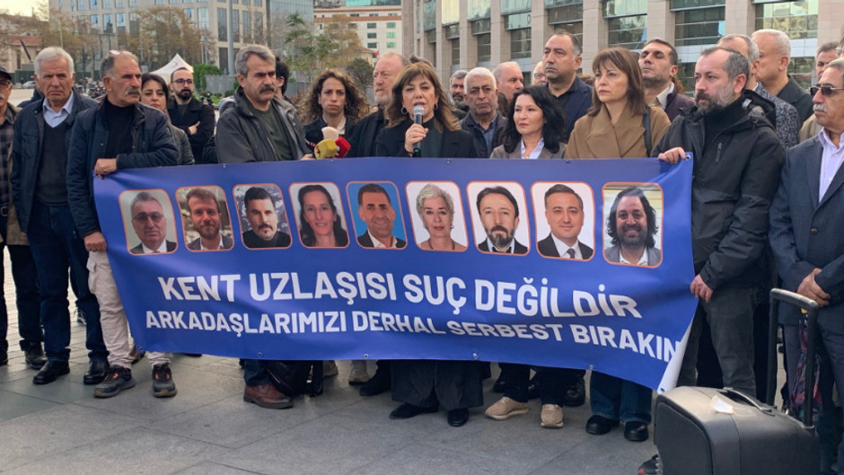 Öte yandan DEM Parti ve Halkların Demokratik Kongresi (HDK), "kent uzlaşısı" davası öncesi kent uzlaşısına özgürlük talebiyle Çağlayan'da İstanbul Adliyesi önünde açıklama yaptı. Basın açıklamasına DEM Parti Erzurum Milletvekili ve Halkların Demokratik Kongresi (HDK) Eş Sözcüsü Meral Danış Beştaş, DEM Parti İstanbul Milletvekili Kezban Konukçu, DEM Parti Grup Başkanvekili Sezai Temelli, DEM Parti İstanbul Milletvekili Celal Fırat, HDK Eş Sözcüsü Ali Kenanoğlu ve İBB Meclisi CHP Grup Başkanvekili Ülkü İnanlı katıldı.