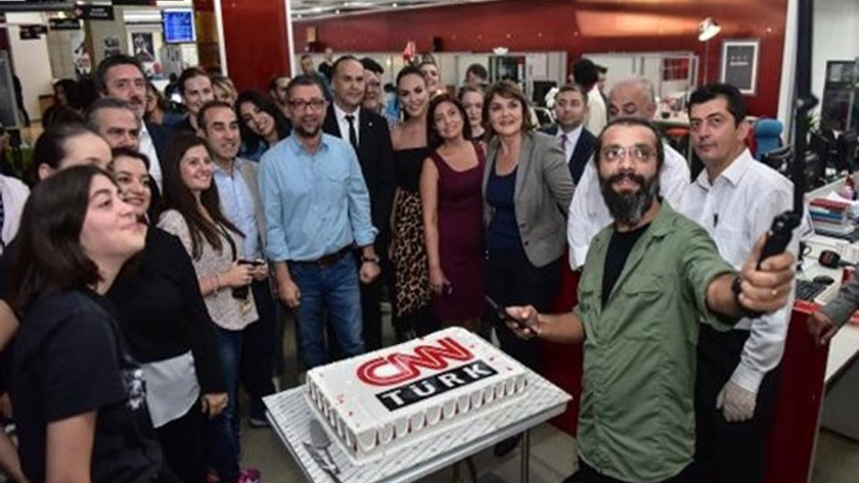 Kutlamada üzerinde CNN Türk logosu bulunan pasta kesilirken,