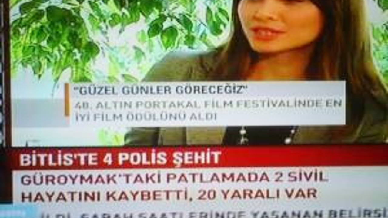 Bitlis’in Güroymak ilçesindeki hain saldırıyı haber kanalları son dakika spotlarıyla duyurdu... Ntv haber bültenindeydi... 24’te ekonomi programı vardı... Habertürk’te ise yaşam... Aynı anda CNNTürk’te ise kültür sanat programı, ekranda da Nefise Karatay yeralıyordu... Konu Altın Portakal’dı... En iyi film ödülünü alan "GÜZEL GÜNLER GÖRECEĞİZ" filmi konu olarak işleniyordu...