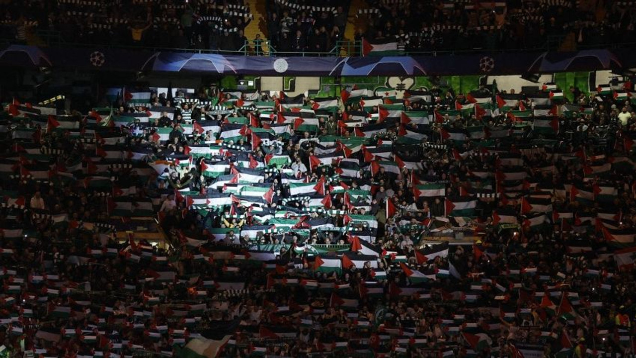 İskoçya’nın köklü kulübünün taraftarı Şampiyonlar Ligin’de oynadıkları maç öncesinde “Maça Filistin bayraklarıyla gelmeyin” uyarısını dinlemedi. Kulüp taraftarları, maçta açtıkları bayraklarla Filistin'e desteğine devam etti...
