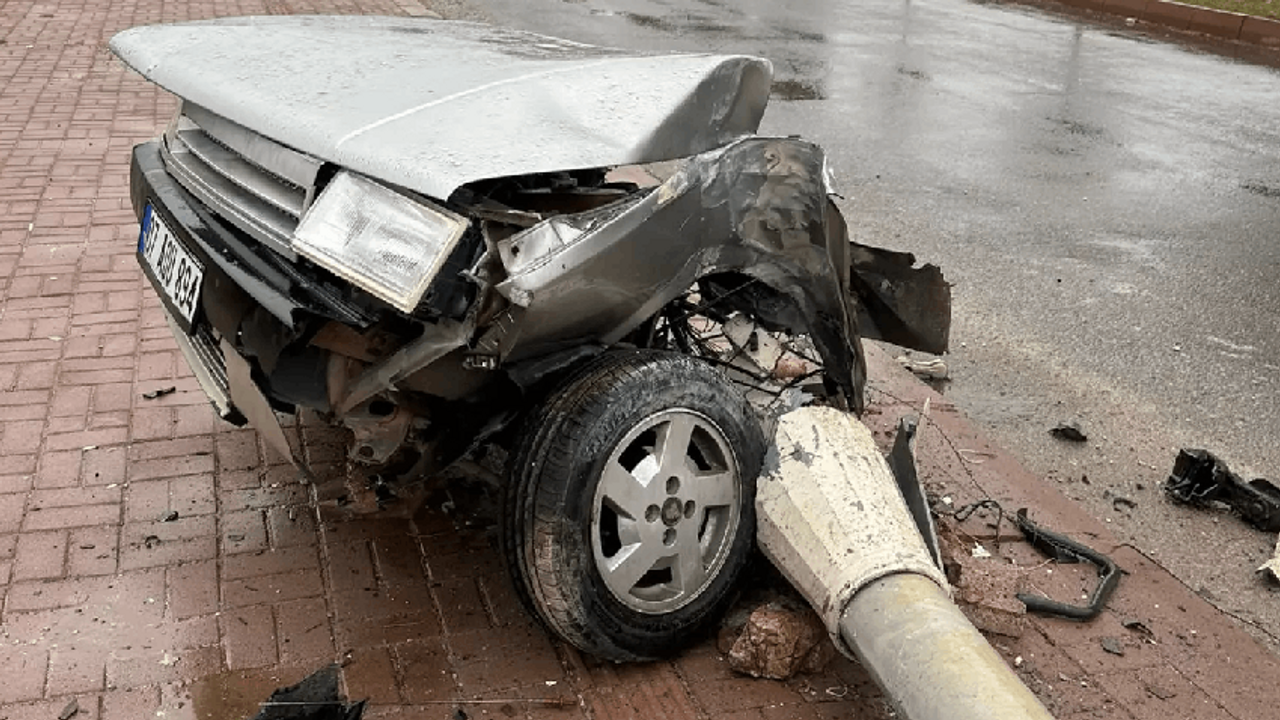 Yol kenarında bulunan aydınlatma direğine çarpan otomobil ikiye bölünerek bir tekerleği de koptu. Çarptığı aydınlatma direği üzerine düşen otomobilin sürücüsü yaralandı.