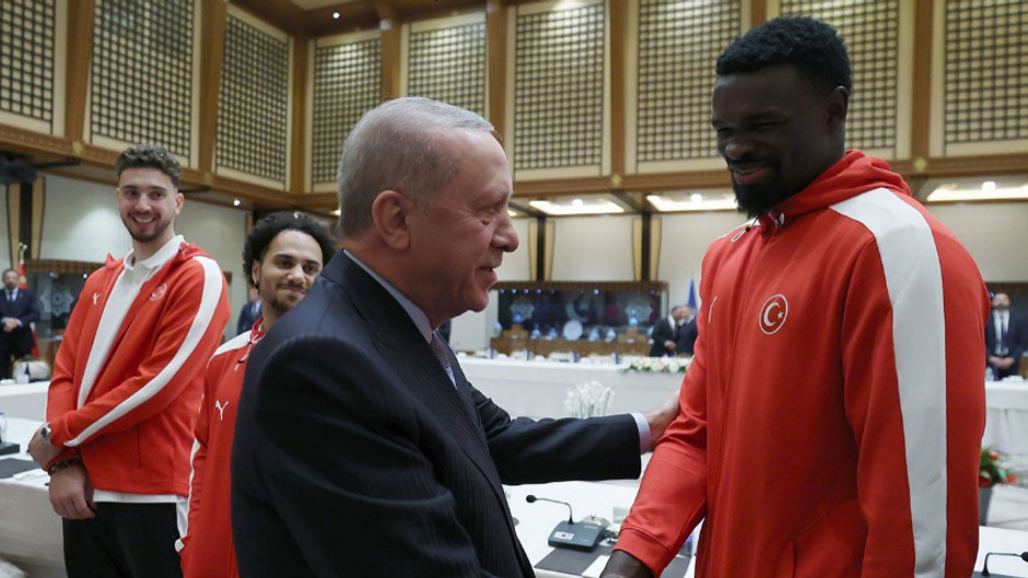 Cumhurbaşkanı Recep Tayyip Erdoğan, 2025 Avrupa Basketbol Şampiyonası’nda gümüş madalya kazanan A Milli Takım’ı Cumhurbaşkanlığı Külliyesi’nde kabul etti. Ziyaret sırasında Erdoğan ile Adem Bona arasında yaşanan diyalog dikkat çekti.