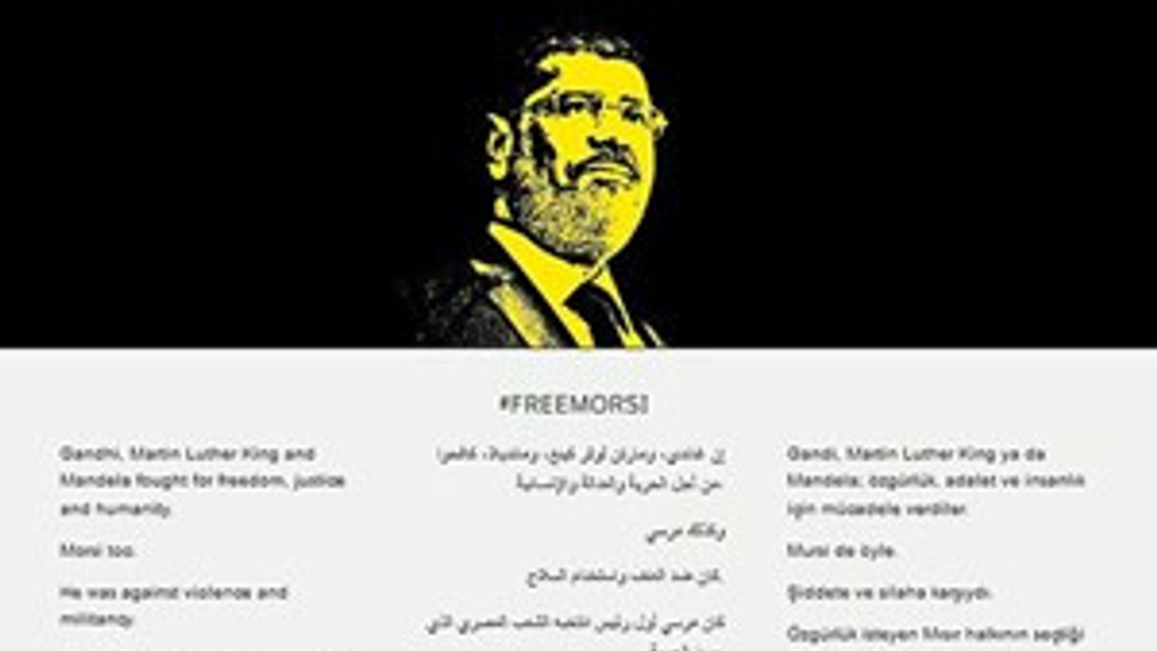 Mısır'ın ilk seçilmiş cumhurbaşkanı Muhammed Mursi'nin bir fotoğrafının siyah zemin üzerinde yer aldığı sitede, Mursi ve arkadaşlarının idamını engellemek için destek çağrısı yapan Türkçe, Arapça ve İngilizce hazırlanmış metne yer verildi.