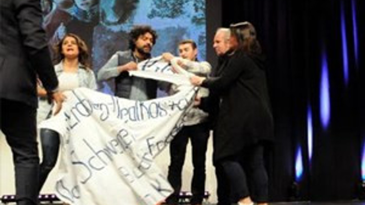 protestocunun sahneye çıkıp, pankart açıp “Kürdistan’a özgürlük”