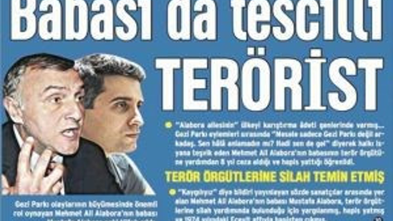 Yeni Akit gazetesi, sanatçı Memet Ali Alabora'nın babası sanatçı Mustafa Alabora'yı "terörist" ilan etti.