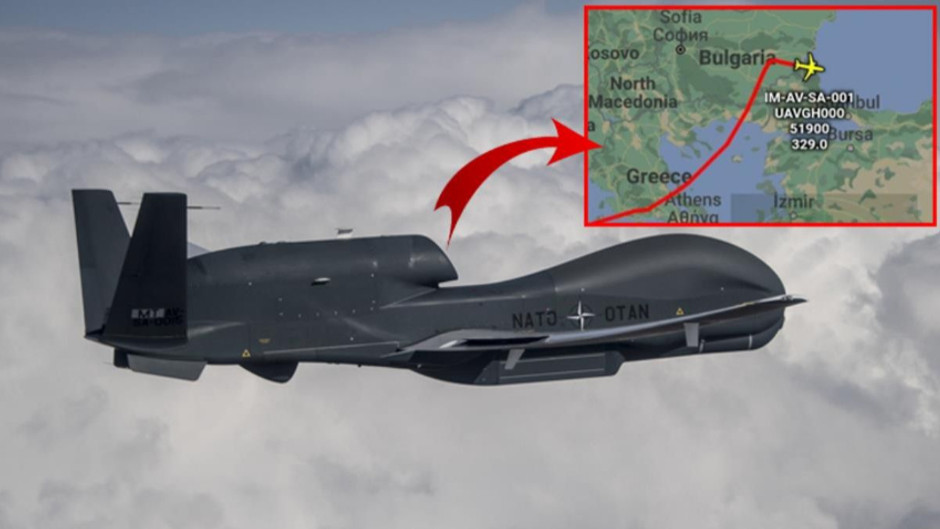 Uçakların rotalarını izleyen FlightRadar24 isimli bir platformda NATO'ya ait RQ-4 Global Hawk tipi bir insansız hava aracının (İHA/Drone) rotasını Türkiye hava sahasına girmemek için uzattığı görülüyor.
