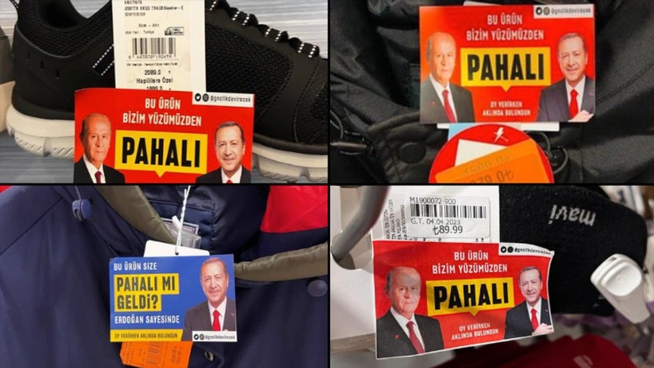 14 Mayıs'ta yapılacak seçimler öncesi hayat pahalılığı en önemli gündem. Bazı market ve mağazalardaki ürünlere yapıştırılan "Pahalı mı geldi? Erdoğan sayesinde" stickerleri ise Twitter gündemine oturmuştu.