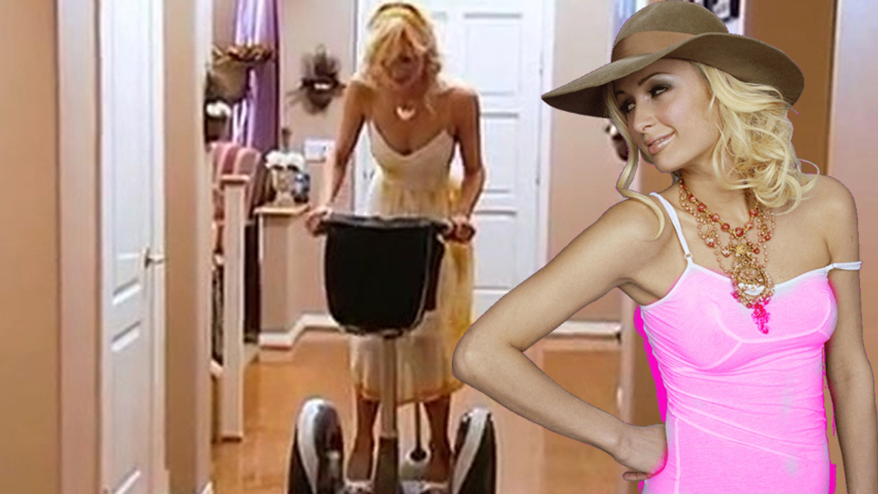 Beyaz elbisesiyle eline paspas alarak yerleri silen güzel şarkıcı, bir ara sıkılarak cinci olarak bilinen elektrik araca binerek paspas yaptı. Paspasın sobasına beline iple bağlayan Hilton'un bu eğlencesi cincir üzerinde dengeyi sağlayamayıp düşmesiyle kötü bitti.