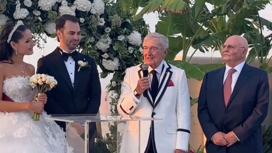 Düğün alanına girişte Lucien Arkas ve eşi Merve Arkas ile karşılaşan Rahmi Koç’un “Bütün yaz senin şarapları içtik” demesi, iş dünyasının önde gelen isimleri arasında sıcak bir sohbet başlattı.