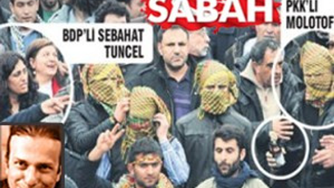 Fotograf üstünde ‘BDP’li Sebahat Tuncel’ ve kalabalıkta biraz ilerisinde görünen yüzünü puşisiyle örtmüş ‘PKK’lı Molotofçu’ işaret edilerek aynı başlığın altını dolduruyordu: “Terörist”.