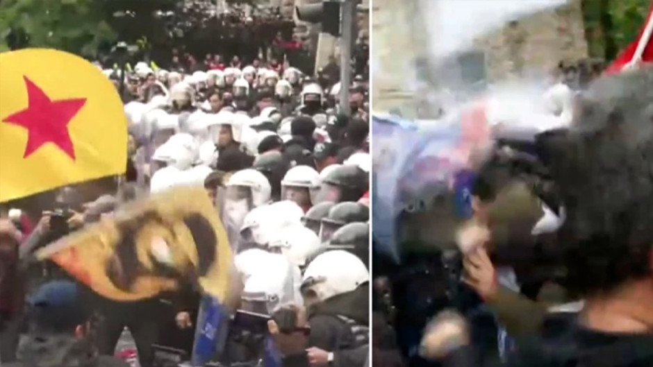 Barikatı aşıp geçmeye çalışan gruplara polis sert müdahalede bulunurken, canlı yayına da yansıyan görüntülerde kalabalık ile emniyet mensupları arasında arbede yaşandığı görüldü.