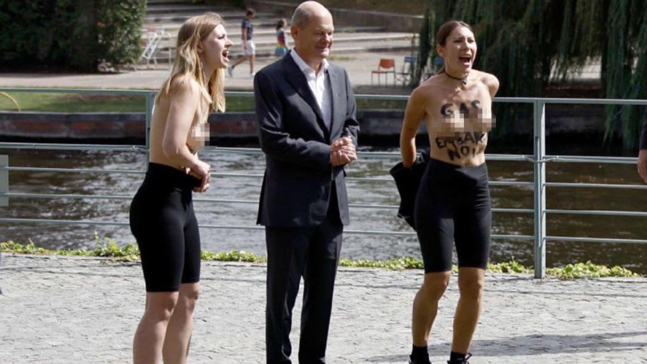 Fotoğraf çekimi sırasında ise dikkat çeken bir eylem yaşandı. İki kadın Scholz yanına gelerek, aniden üstlerini çıkardı.