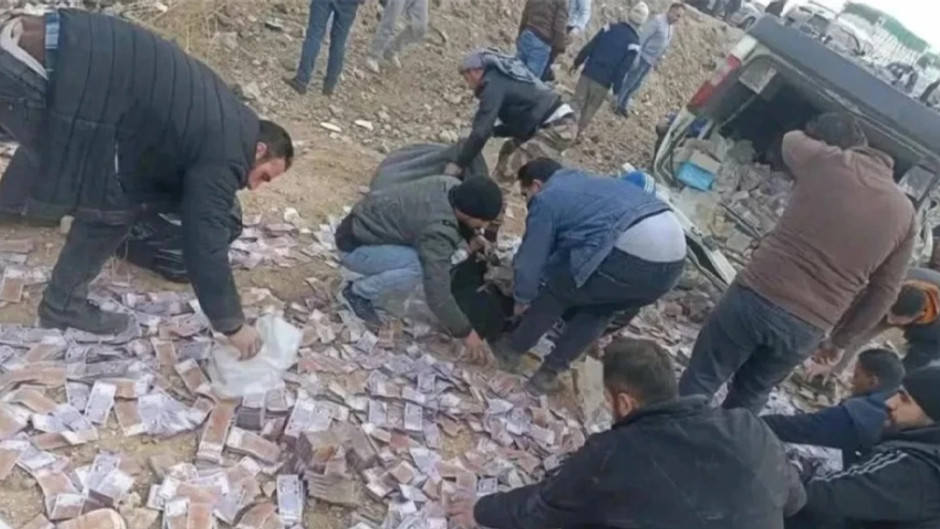 Suriye Merkez Bankası aracı devrildi, yola saçılan paraları halk topladı