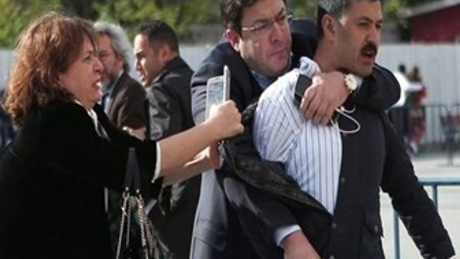 saldırganın gırtlağına sarılan Dilek Dündar’ı çizdi.