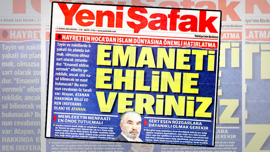 Yeni Şafak gazetesinin "Hayrettin Hoca'dan İslam dünyasına önemli hatırlatma: Emaneti ehline veriniz" manşeti tartışma yarattı.